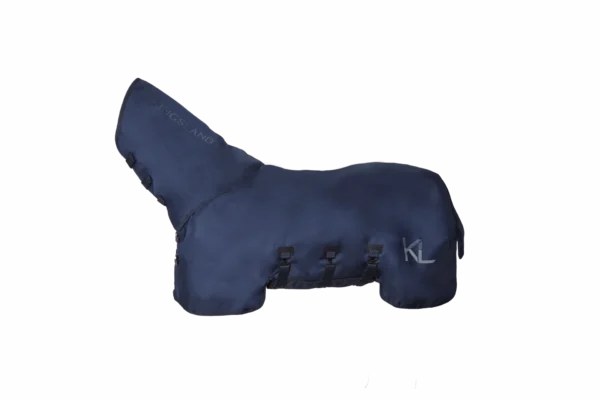 Täcket har en elegant navyblå design med klassiska Kingsland-detaljer, vilket gör det lika snyggt som praktiskt – perfekt både i stallet och under transport.